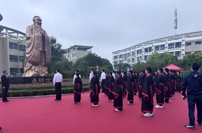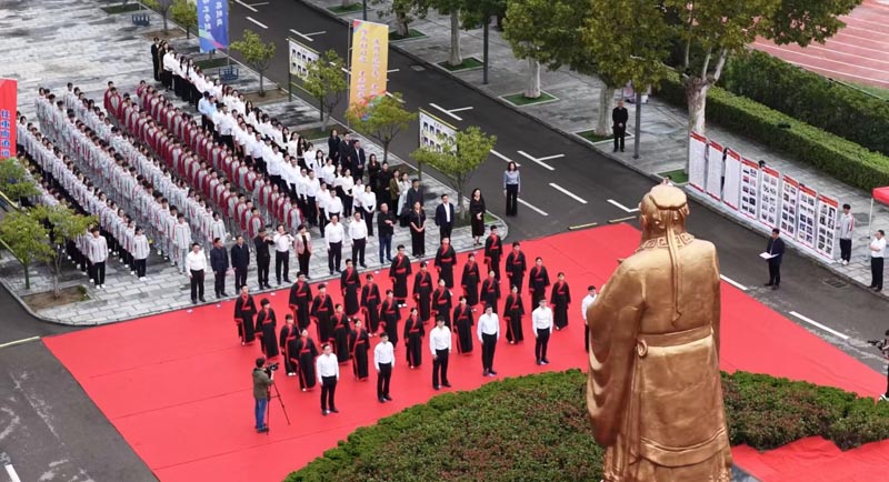 上午9時(shí)28分,典禮正式啟幕。在全體師生莊重的注目中,四位主禮嘉賓緩緩揭去覆蓋于圣像之上的紅色帷幕。一尊高7.2米、面容慈和、風(fēng)范儒雅的孔子圣像巍然矗立于校園,其深邃的目光仿佛跨越千年時(shí)空,將智慧的光芒灑滿天一校園。在場(chǎng)師生自發(fā)整理衣冠,肅立致敬,向先師行注目禮,現(xiàn)場(chǎng)洋溢著對(duì)傳統(tǒng)文化與教育先哲的崇高敬意。