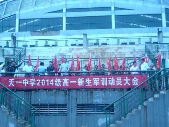 動員大會在莊嚴的國歌聲中拉開帷幕。首先由馬曉林校長致歡迎辭,他代表天一中學向新加入一中大家庭的所有新同學表示衷心的祝賀,對全體教官們,表示最熱烈的歡迎和誠摯的感謝。他指出,軍訓是踏入校門的第一課,要求大家吹響刻苦爭先、向勝利進軍的號角,用汗水去耕耘,用勤奮去收獲,共同創造美好的明天。他滿懷激情地介紹了我校的優良校風和辦學目標,特別是我校今年高考所取得的優異成績。他強調,軍訓工作是一項國防軍事教育活動,在全面推進素質教育、促進學生健康成長方面,具有其他教育不可替代的作用。他也向同學們提出幾點軍訓要求,堅信軍訓必將在同學們的人生道路上留下深深的印記。之后,軍訓教官代表李教官、2014級高一新生代表周昱新、教師代表戴鳳帥先后作了發言。最后,與會的各位領導向各軍訓連隊授旗,由徐杰校長宣布軍訓正式開始。