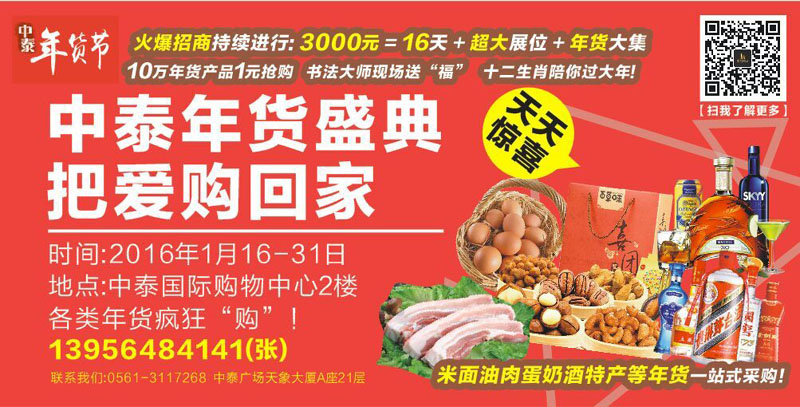 淮北中泰年貨節時間:2016年1月16日—31日,為期十六天。地點:淮北中泰國際廣場(中泰淘寶街)。參展種類:特色農產品及特色食品、糖酒/茶及飲料、民俗文化商品、服裝家紡、家電家居、汽車等。