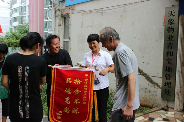 8月2日,淮北天象物業管理公司保潔員祝道俠和任翠萍像往常一樣在清理小區垃圾時,撿到一個皮包,打開一看里面裝有一萬多元,她們意識到這包應該是業主不小心遺失的,于是趕緊向物業公司領導匯報,希望可以及時聯系上業主。物業公司立即通過走訪詢問找到了失主,失主喜極于泣,感激萬分!事后,業主將一面寫有“拾金不昧,品德高尚”八個大字的錦旗、水和糖送到了小區物業管理處,還燃放了兩掛鞭炮,對祝道俠和任翠萍兩名同志拾金不昧的義舉表示感謝。